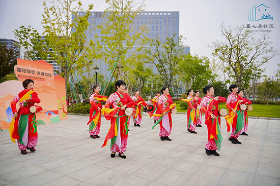 另一邊的腰鼓班則是一派熱鬧歡騰的景象。鼓槌起落,紅綢翻飛,學(xué)員們身著統(tǒng)一服裝,踏著整齊的步伐,敲出鏗鏘有力的節(jié)奏。腰鼓講究“身隨鼓動,鼓隨人鳴”,從基本的鼓點節(jié)拍,到復(fù)雜的隊形變換,老人們頂著烈日反復(fù)練習(xí),汗水浸濕了衣衫,卻澆不滅心中的熱情。結(jié)業(yè)展演中,激昂的鼓點響徹社區(qū),豪邁的姿態(tài)盡顯活力,展現(xiàn)出新時代老年人昂揚向上的精神風(fēng)貌。