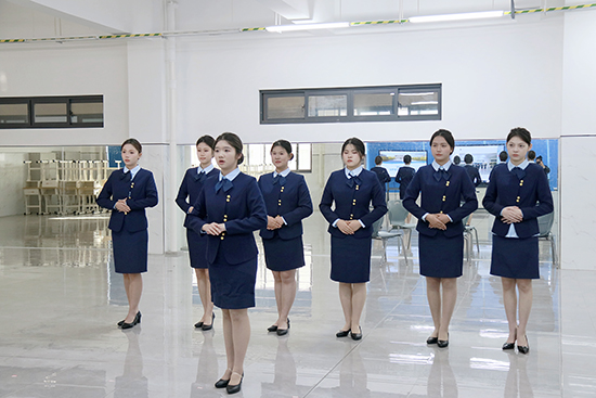 航空服務(wù)專業(yè)的同學(xué)們身著標(biāo)準(zhǔn)制服,妝容淡雅得體,長發(fā)整齊盤起,盡顯端莊大方的職業(yè)氣質(zhì)。