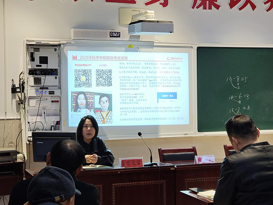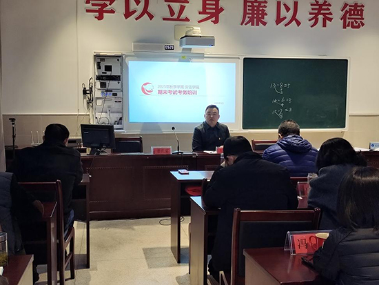 教務(wù)處副主任梅徐就期末考試監(jiān)考工作對全體教師進(jìn)行了考前培訓(xùn),對監(jiān)考工作流程、監(jiān)考人員職責(zé)、考試違紀(jì)處理,特別是對考生人臉識別的操作進(jìn)行了重點(diǎn)培訓(xùn)。學(xué)院黨支部委員曾慶富對考務(wù)和監(jiān)考工作中容易出現(xiàn)的問題和注意事項(xiàng)進(jìn)行了強(qiáng)調(diào)。
