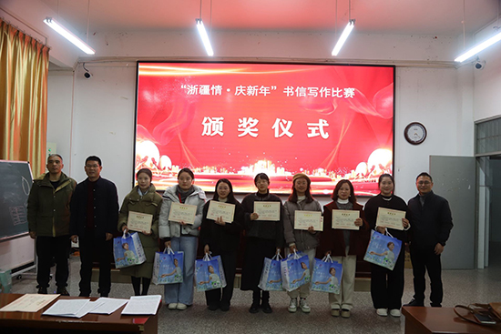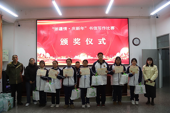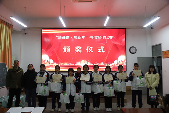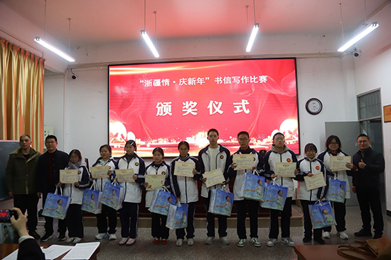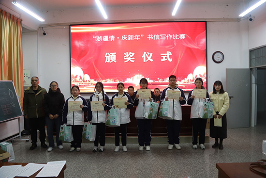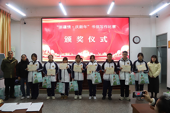 1月15日晚上,浙江省慶元縣職業(yè)高級(jí)中學(xué)階梯教室洋溢著溫馨熱烈的氛圍,“浙疆情,慶新年”兩校書信寫作比賽頒獎(jiǎng)儀式在此隆重舉行。中國(guó)郵政慶元分公司總經(jīng)理雷偉軍、慶元職高校長(zhǎng)張發(fā)等嘉賓出席儀式并為獲獎(jiǎng)?wù)哳C獎(jiǎng)。