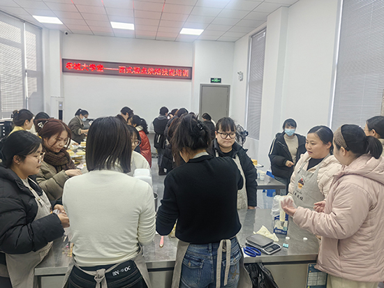 培訓現(xiàn)場暖意融融、香氣漸濃。呂櫻老師細致講解打發(fā)奶油、裱花裝飾等技巧要點,學員們圍站在操作臺前認真聆聽、仔細記錄;實操環(huán)節(jié)里,大家揉面、擠花、點綴糖霜,在老師的耐心糾錯與指導下,原本陌生的烘焙步驟逐漸變得熟練。當一個個造型精致、香氣四溢的糕點從手中誕生時,學員們臉上洋溢著滿滿的成就感,現(xiàn)場歡聲笑語不斷,香甜氣息彌漫整個教室。