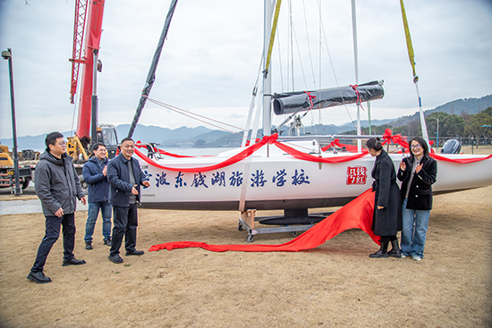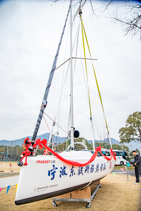 1月29日,東錢湖畔的逸帆航海俱樂部迎來了一場別開生面的儀式——寧波東錢湖旅游學校第二艘“琺伊—23”龍骨型帆船“錢紅號”正式下水。寧波市教育局體藝勞處處長周賢豐、團工委書記李雨寒,學校黨總支書記徐春燕、校長金立峰、副校長董立毅等領導,以及指導老師和學生代表共同見證了這一重要時刻。
