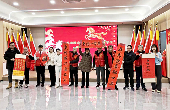 第二篇章“綻·樂(lè)齡風(fēng)采”生動(dòng)詮釋了銀齡群體的蓬勃朝氣。韓金芳等帶來(lái)的非洲鼓《美麗中國(guó)》率先登場(chǎng),激昂鼓點(diǎn)與明快旋律交織,表達(dá)了對(duì)祖國(guó)山河的深情禮贊。隨后,東信社區(qū)黨委書(shū)記、居委會(huì)主任戴筆峰登臺(tái)致辭,向全體居民致以誠(chéng)摯的新春祝福,并展望社區(qū)未來(lái)發(fā)展愿景。社區(qū)書(shū)畫(huà)達(dá)人現(xiàn)場(chǎng)創(chuàng)作并贈(zèng)送書(shū)畫(huà)作品,由社區(qū)班子成員代表接收,筆墨丹青間流淌著深厚的文化底蘊(yùn)與鄰里情誼。展演環(huán)節(jié)精彩不斷:太極隊(duì)表演的《太乙游龍拳》剛?cè)嵯酀?jì),盡顯東方哲學(xué)之美;浪浪姐妹團(tuán)的舞蹈串燒活力綻放,瞬間點(diǎn)燃全場(chǎng)熱情;民樂(lè)團(tuán)演奏的《賽馬》緊扣馬年主題,將現(xiàn)場(chǎng)氛圍推向高潮。此外,男聲小合唱《少林少林》、健身秧歌舞《又唱瀏陽(yáng)河》、深情朗誦《我們的社區(qū) 我們的家》等節(jié)目輪番上演,充分展現(xiàn)了社區(qū)居民的多才多藝與對(duì)家園的深切熱愛(ài)。
