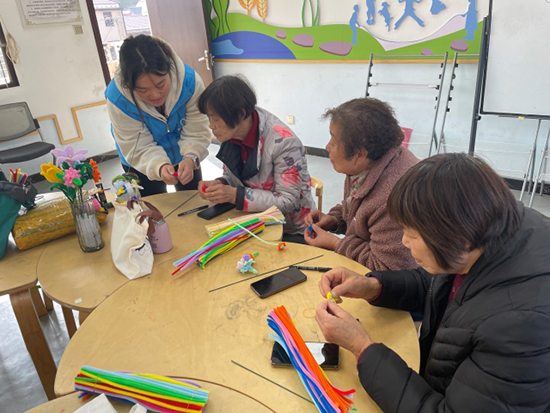 活動現場,趙晶蕊老師提前備好彩紙、絲帶、剪刀等材料,從花型設計到纏繞技巧,從配色搭配到定型修飾,逐一拆解步驟、示范講解。“先把彩紙對折三次,剪出花瓣形狀,再沿著邊緣輕輕卷出弧度,這樣更顯飽滿。”老師的講解通俗易懂,老人們聽得聚精會神,手指跟著節奏慢慢操作。遇到拿捏不準的地方,大家互相探討、互幫互助,實踐所內滿是溫馨和睦的氛圍。