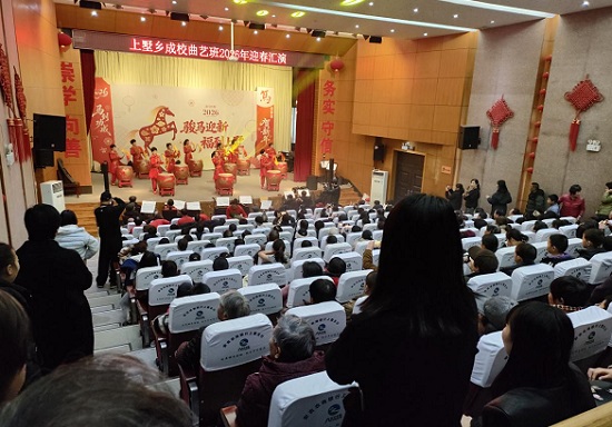聯歡會現場,上墅學習中心銀齡曲藝長班選送了三個節目登臺,分別是《民樂合奏(走進新時代和歌唱祖國)》《越劇聯唱》,《舞蹈(開門紅)》,再串接上上墅村委和其他單位選送的八個節目,合匯成整場聯歡會的演出陣容。節目有歌舞、有樂器、有戲曲、有曲藝,說唱彈跳輪番登臺,視聽豐富精彩紛呈,既飽含濃郁的當地民俗風情,又生動展現了上墅村民的精神風貌,為現場觀眾送上了一場浸潤鄉情、直擊心靈的文化大餐。