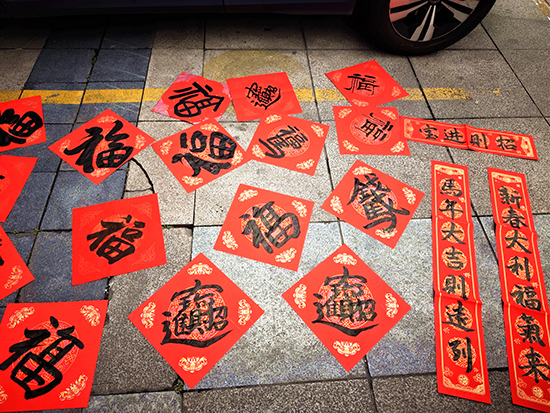 隨后,5位書法同學攜手創作,蘸墨、運筆如行云流水。一個個不同字體的“福”字,一幅幅馬年吉祥春聯躍然紙上。寄托著對轄區居民的新春美好祝愿,和對環衛工人、外賣小哥、外賣騎手等戶外從業人員深深的新年關切。轄區居民駐足欣賞,交流稱贊,歡聲笑語與融融暖意交織回蕩。