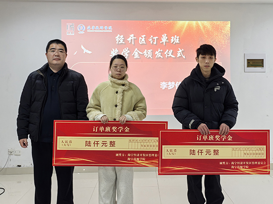 會上舉行經開區訂單班獎學金頒發儀式,蔡綠成等6名優秀學子獲表彰,周剛、壽祝平、錢國平為獲獎學子頒獎。獲獎學子精神抖擻、意氣風發,充分展現了新時代技能青年勤學苦練、精益求精的良好風貌,也彰顯了“鄉圈共培”模式的育人成效。