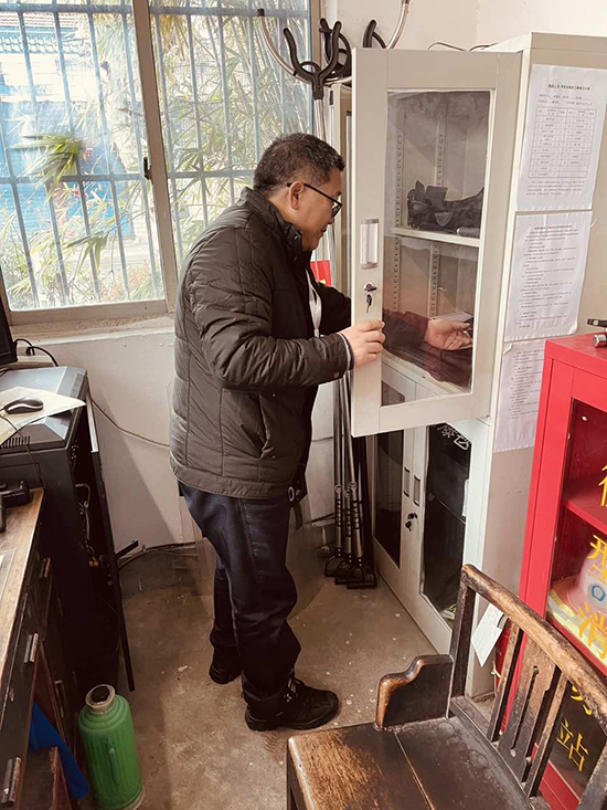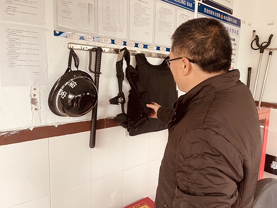 督查首站來到楓橋鎮梅苑小學警務室,孫文明重點檢查了消防器械、安保設備的保管與配備情況,現場查看發現,該校防衛器械標注清晰、擺放有序、整潔完好,數量完全匹配值守人員需求。現場測試中,保安人員能熟練操作一鍵報警器,精準完成監控視頻回放查看,校園視頻監控保存時長達標90天;警務室內6本安全管理記錄本填寫完整、內容詳實,且未發現違規使用取暖設備現象。在校門區域,督查組核查了減速帶、警示標志的設置情況,確認硬質防沖撞設施配備到位,家長等候區規劃合理。隨后,督查組實地踏看校園圍墻內側、籃球架、閑置宿舍樓、原食堂餐廳及車棚等重點區域,所有閑置房屋均實現規范上鎖管理,無安全隱患。