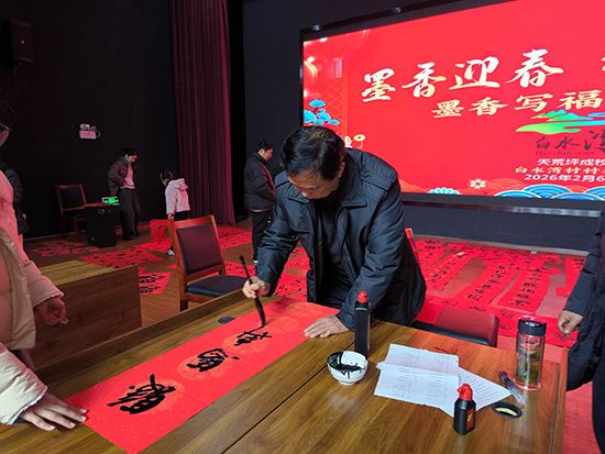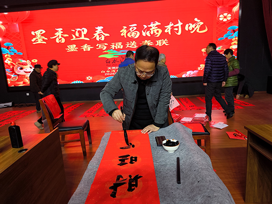 翰墨飄香迎新春,義寫春聯送祝福。2月6日,安吉社區教育學院天荒坪分院(天荒坪成校)聯合天荒坪鎮白水灣村委共同舉辦“墨香寫福送春聯”活動,特邀退休校長李熙庭、兄弟成校校長及老師葉南等6名書畫愛好者現場揮毫,為村民送上滿載年味的文化“年貨”。