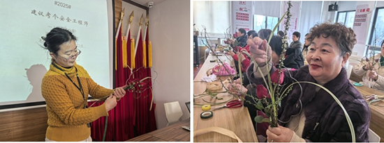 1月的非遺花藝體驗活動同樣精彩紛呈。非遺老師邢晗從中國傳統插花三千余年的歷史源流切入,詳解其“自然美、意境美、線條美、整體美”的核心特質與“起把宜緊,瓶口宜清”的古法技藝。結合社區空港特色與居家生活場景,老師引導居民將生活感悟融入創作,玫瑰、菖蒲、南天竹等時令花材在大家手中煥發生機,一件件獨具韻味的花藝作品相繼誕生。居民在修剪搭配中體會美學真諦,在相互欣賞中增進情誼,讓花藝美學真正走進生活。