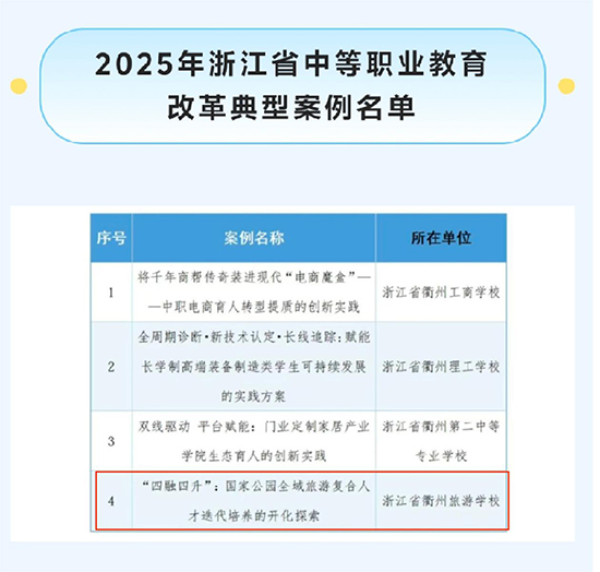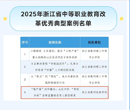 近日,浙江省教育科學研究院公布了2025年全省中等職業教育改革典型案例遴選結果。浙江省衢州旅游學校報送的《“教產服”閉環融合:山區中職“青團來啦”品牌直播助農育人路徑探索》與《“四融四升”:國家公園全域旅游復合人才迭代培養的開化探索》兩個案例分別獲評“優秀典型案例”與“典型案例”。這是學校在省級教學改革案例評選中獲獎數量與層次的歷史性突破,標志著學校在深化“三教”改革、推進育人模式創新、服務學生全面發展和區域經濟社會發展方面取得了顯著成效。