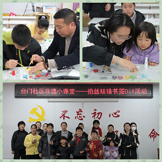 2月7日上午,臺門社區文化禮堂內,掐絲琺瑯書簽DIY活動吸引眾多親子家庭參與。非遺志愿者老師講述掐絲琺瑯的歷史淵源與工藝之美,家長與孩子默契配合,以金絲為筆,以釉彩為墨,在專注勾勒與填色間,讓樸素的書簽漸次綻放絢麗光澤。家長們感嘆,活動讓孩子近距離觸摸非遺,更讓陪伴有了溫度;孩子們則欣喜于“原來非遺這么有趣”。