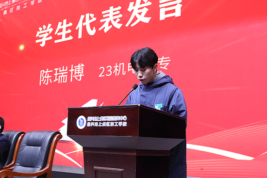 學生代表陳瑞博(23級機電大專)分享了從入學迷茫到斬獲省賽一等獎的成長歷程。他感言:備賽時泡在工作室里反復練習,放棄了周末與假期,在不斷地磨煉中學會了堅持,所有耀眼的榮光背后,不僅是日復一日的堅持,更是對老師們一路陪伴、指導、幫助、鼓勵的感恩。