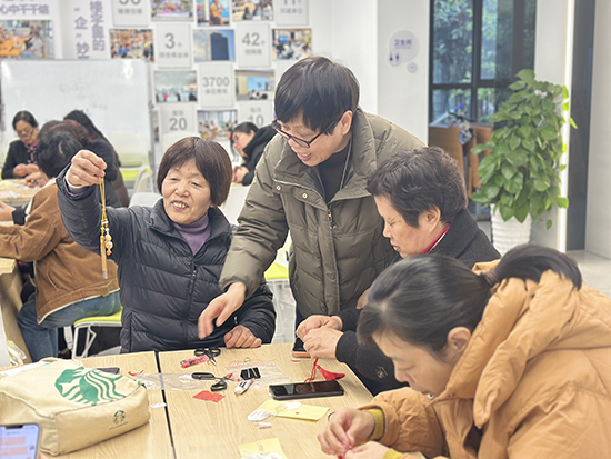 參與活動的阿姨們圍坐在一起,一邊認真聆聽講解,一邊動手實踐。穿針引線間,大家相互交流、互幫互助,現場氣氛溫馨而熱烈。經過一番精心制作,一個個精致典雅、寓意吉祥的宋錦掛件逐漸成型。有阿姨興奮地舉起自己的作品展示,臉上洋溢著成就感與喜悅,小小的掛件不僅承載著傳統工藝之美,更傳遞著社區對女性同胞的美好祝福。