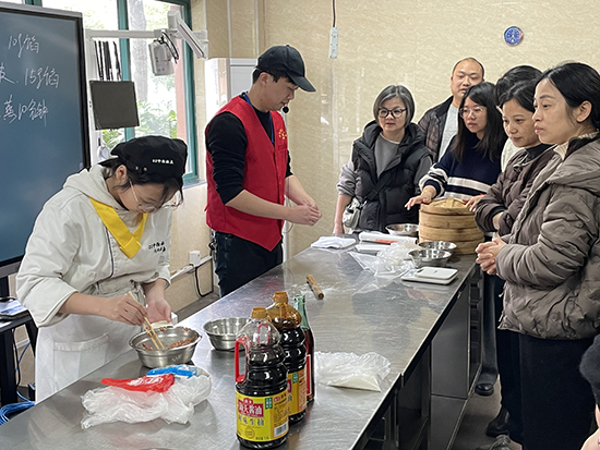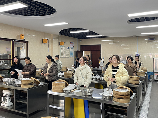 在老師的鼓勵和指導下,女職工們紛紛動手實踐,開啟了自己的“面點創作之旅”。起初,揉面不勻、搟皮歪斜、捏褶松散等問題時有發生,但大家毫不氣餒,互幫互學,在一次次的嘗試中逐漸找到手感。從生疏到熟練,一張張薄厚均勻的面皮,經過巧手填餡、捏褶,逐漸變成了形態飽滿的鮮肉小籠包和形似秋葉的咸菜秋葉包。當親手制作的面點整齊入籠,熱氣裹挾著面香與餡香彌漫整個實訓室,大家臉上洋溢著滿滿的成就感和幸福感,歡聲笑語交織成一曲動人的勞動樂章。