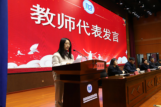 老師的辛勤付出和學生的不懈努力鑄就了學校的高質量發展。教師代表裘夢雨和學生代表唐紫萱依次上臺發言,分別表達了新學期的愿望和決心,抒發了對未來的期待與憧憬。
