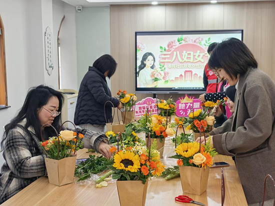 上午九點(diǎn)半,活動(dòng)室里已是花香氤氳。玫瑰的濃郁、雛菊的溫馨、向日葵的明媚,與幸福草的清香交織在一起,勾勒出濃濃的節(jié)日氛圍。居民歡聚一堂,從花卉的選材、修剪、保鮮,到色彩的搭配、高低錯(cuò)落的構(gòu)圖,整個(gè)創(chuàng)作過(guò)程去中心化自由創(chuàng)作,有人追求色彩的撞擊,將紅玫瑰與黃鶯草熱烈交織;有人青睞素雅的留白,只取兩三支康乃馨點(diǎn)綴于綠葉之間;還有人別出心裁,將修剪落下的細(xì)小花苞編織成精美的小花束。這種不設(shè)限的創(chuàng)作過(guò)程,恰恰是現(xiàn)代女性獨(dú)立、自信、自主精神的生動(dòng)寫照。