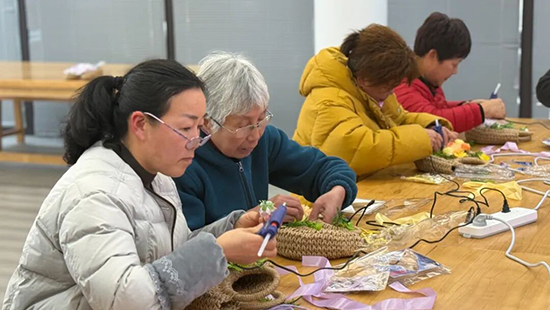 活動(dòng)中,工作人員采用“講解+演示”的方式,細(xì)致講解編織包花藝裝飾的技巧與要點(diǎn)。居民們認(rèn)真聆聽(tīng)、熱情參與,在工作人員耐心指導(dǎo)下,從生疏到熟練,充分發(fā)揮創(chuàng)意,精心搭配花色。現(xiàn)場(chǎng)氛圍融洽溫馨,大家互相交流、互幫互助,鄰里情誼在歡聲笑語(yǔ)中不斷升溫。不一會(huì)兒,一件件精致美觀的編織作品相繼完成,大家手持成品合影留念,臉上洋溢著幸福的笑容。