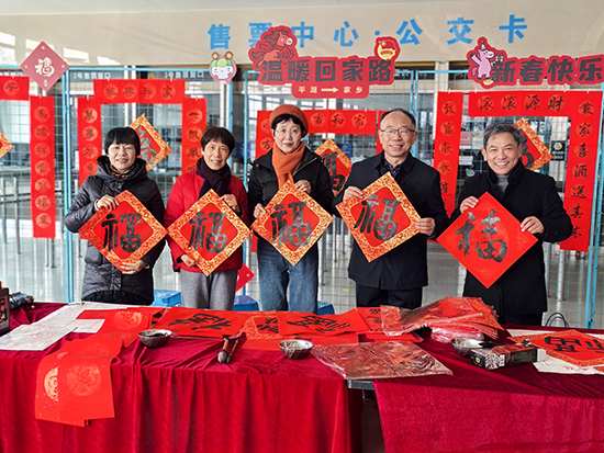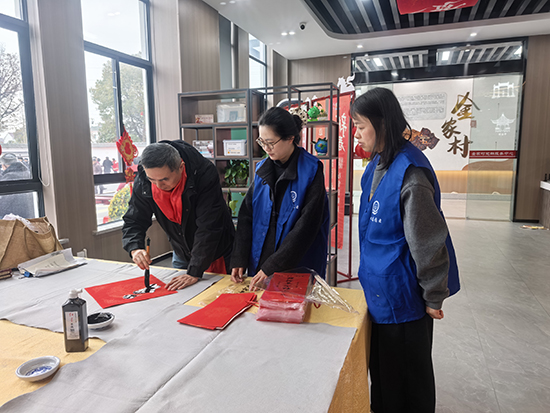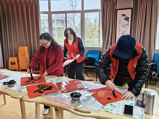 書法班、書畫創(chuàng)作班的十幾位學(xué)員于學(xué)期結(jié)束前,在龔國(guó)銘老師的帶領(lǐng)下,著手開展寫春聯(lián)活動(dòng)。自12月下旬開始到2月中旬,共組織了近40場(chǎng)送福送春聯(lián)活動(dòng)。為機(jī)關(guān)、學(xué)校、銀行、老年公寓、鄉(xiāng)鎮(zhèn)、村、社區(qū)、殘聯(lián)、企業(yè)等共書寫春聯(lián)3800多對(duì)、福字近5000個(gè)、迎春對(duì)聯(lián)軸300多軸、福牌和掛件1000多塊,為廣大市民送上真摯的新年問(wèn)候,以筆墨傳溫情、書香賀新春,傳遞美好祝愿。