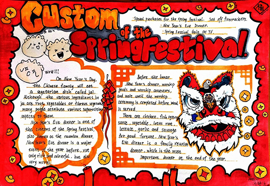 許多同學以春節文化為核心主題,將傳統年味與英語表達完美結合,既鞏固了語言知識,又增強了文化自信,真正做到了用英語傳遞中華優秀傳統文化。小報里不僅有工整書寫的Spring Festival、Chinese New Year等核心詞匯,更有用流暢的英文段落介紹貼春節傳統習俗,搭配生肖馬、福字等手繪元素,色彩鮮艷、年味十足。