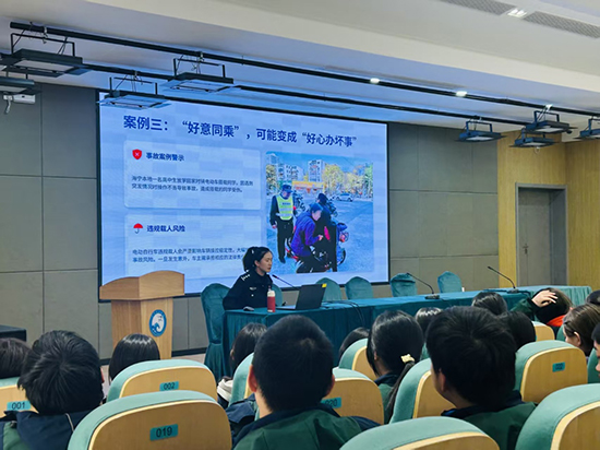 宣講現(xiàn)場(chǎng),交警同志以本地電動(dòng)車(chē)交通事故典型案例為切入點(diǎn),通過(guò)視頻回放、圖片對(duì)比等形式,直觀呈現(xiàn)了超速行駛、逆向騎行、不佩戴安全頭盔、違規(guī)載人等違法行為的嚴(yán)重危害,用“身邊事”警醒“身邊人”,讓同學(xué)們深刻認(rèn)識(shí)到交通陋習(xí)背后的安全隱患。