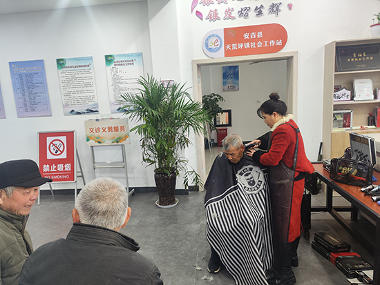 隔壁的義剪區,山河村美發店的許筱琴美發師正低著頭忙碌。她手里的剪刀上下翻飛,不一會兒就給張阿公理了個精神的短發:“您看這樣行不行?要是長度不合適我再調整”。張阿公對著鏡子摸了摸頭發,笑得合不攏嘴:“好得很,比城里理發店剪得還貼心”。