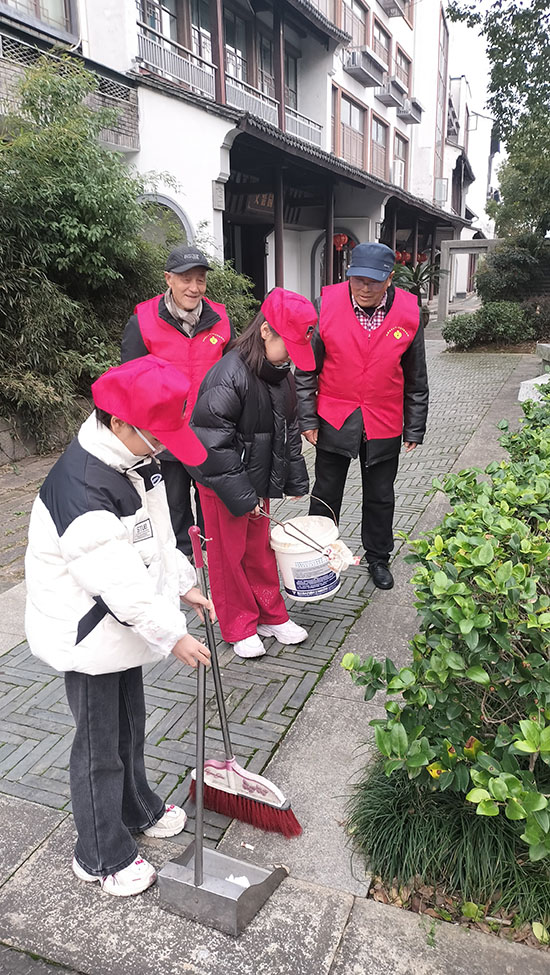 故事分享會后,志愿服務實踐活動同步開展。在退休老師們的帶領下,小小志愿者們手持掃帚、夾子、垃圾袋等工具,分組對周邊公共區域進行環境清潔。大家有的彎腰撿拾綠化帶內的煙頭、紙屑,有的細心擦拭海角公交站臺的座椅,還有的走進獨居老人家中,開展慰問幫扶。同學們干勁十足、認真細致,不放過任何一處衛生死角,用實際行動詮釋“不怕臟、不怕累”的雷鋒精神。