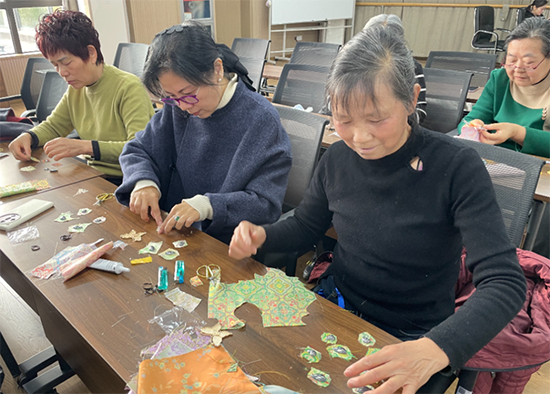 理論講解結(jié)束后,居民們迅速投入創(chuàng)作,裁剪、黏膠、拼接,每一個(gè)步驟都認(rèn)真細(xì)致、一絲不茍。遇到困難、拼接不平整等問(wèn)題,老師俯身耐心指導(dǎo),手把手糾正手法;居民們也相互交流技巧、分享經(jīng)驗(yàn),歡聲笑語(yǔ)間,陌生感悄然消散,課堂氛圍溫馨而熱烈。