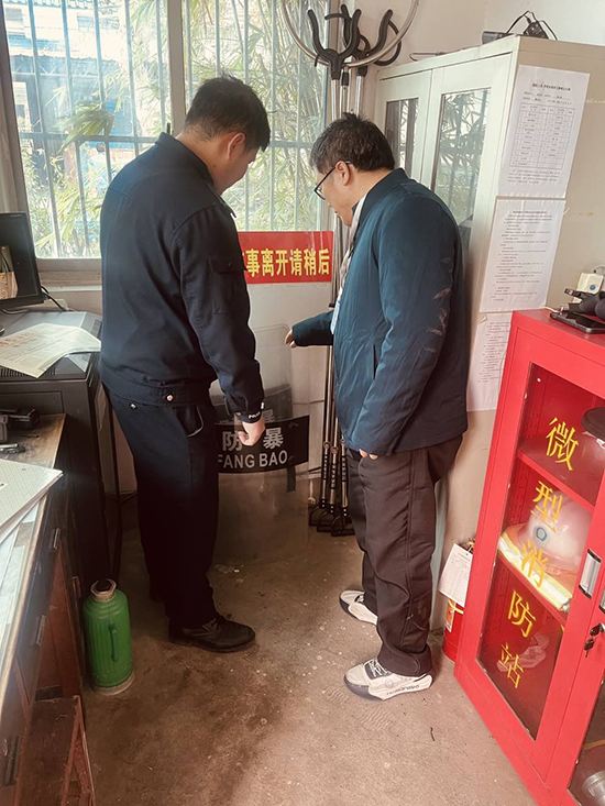 督查首站來到楓橋鎮(zhèn)梅苑小學(xué)警務(wù)室。孫文明重點(diǎn)檢查消防器械、安保設(shè)備的保管與配備情況。經(jīng)現(xiàn)場查看,該校防衛(wèi)器械標(biāo)注清晰、擺放有序、整潔完好,數(shù)量與值守人員需求匹配,無臨期、過期現(xiàn)象。督查組現(xiàn)場對保安人員進(jìn)行監(jiān)控設(shè)備操作測試,保安人員能熟練使用一鍵報警器,精準(zhǔn)回放查看監(jiān)控視頻;警務(wù)室內(nèi)6本安全管理記錄本填寫規(guī)范、內(nèi)容詳實。