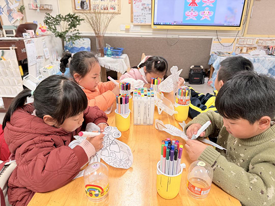 活動室里暖意融融,空白風箏整齊鋪展在桌上,各色顏料、畫筆一應俱全。孩子們圍坐在一起,聽完老師講解風箏相關的歷史習俗后,紛紛拿起畫筆。一個小女孩選了好幾種顏色,一筆一筆往上涂;旁邊的男孩則把整個風箏涂成了大紅色,涂完舉起來晃了晃:“我的風箏飛起來肯定最顯眼!”還有孩子不小心把顏料抹到了手上,舉著臟兮兮的手給老師看。老師笑著提醒:“慢點涂,別涂到身上了。”