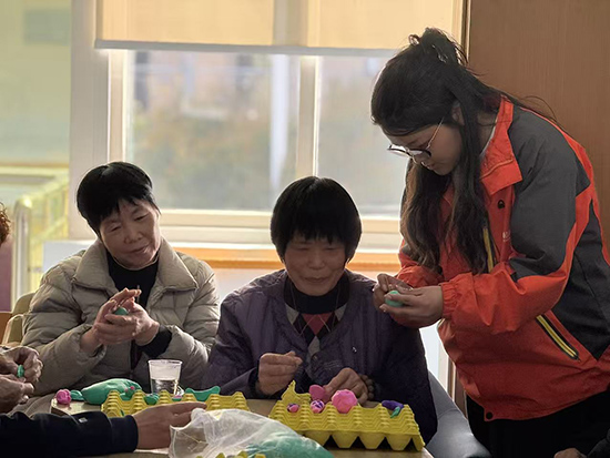 活動現場氛圍溫馨而熱烈,老人們早早來到活動場地,滿懷期待地等待活動開始。工作人員為老人們準備了黏土、雞蛋托、剪刀、膠水等手工材料,并耐心細致地講解制作方法與技巧。老人們認真聆聽、積極互動,在工作人員的指導下,大家充分發揮想象力與創造力,用黏土捏制出形態各異的小動物、小花等造型,再將雞蛋托進行裁剪、拼接、裝飾,一件件充滿童趣與巧思的作品逐漸成型。看著親手打造的“煥新”蛋殼作品,老人們臉上洋溢著成就感與自豪感,現場歡聲笑語不斷,濃濃的溫情在指尖傳遞。