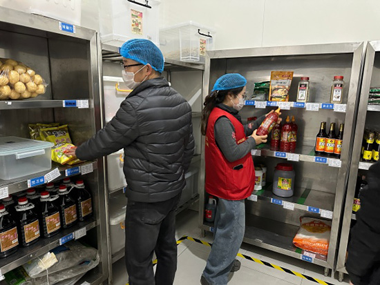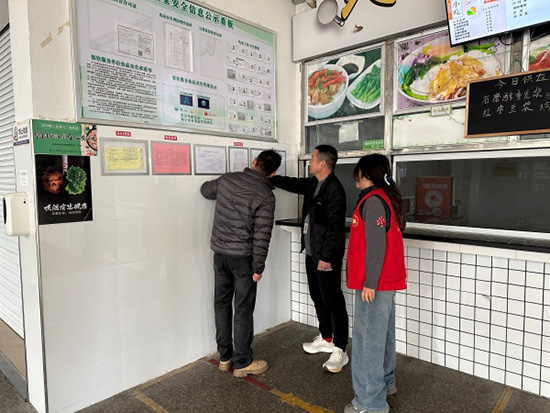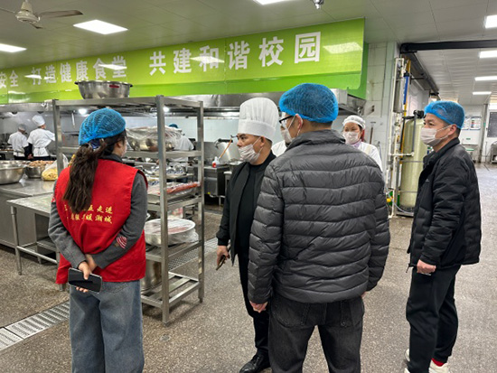 走訪中,黨員教師們按照食堂衛生管理規范,佩戴口罩、帽子,有序查看食堂各功能區域。重點檢查操作間、食材庫房環境衛生,細致核查設備運行與維護情況,并圍繞食品安全責任落實、原材料采購與儲存、餐飲具清洗消毒等關鍵環節進行認真核驗。