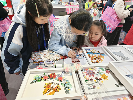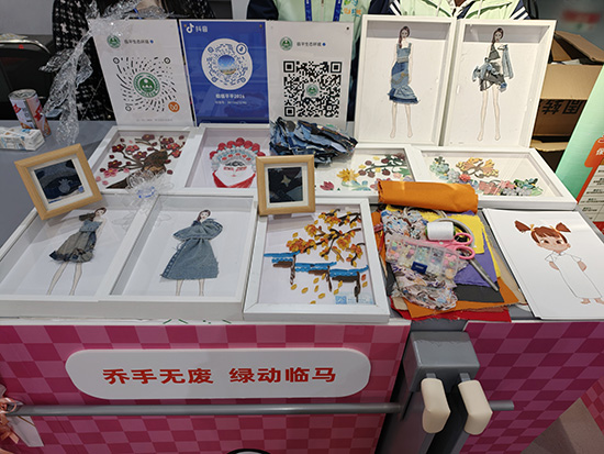 室內展位,綠藝社成員夏悅、董馨于、秦佳筠、俞依雯與指導教師潘露琪、姚賽花精心布置了充滿綠色藝術氣息的展區,從舊牛仔褲改造的創意手工裝飾畫到專業廢棄紙張制作的衍紙畫,每一件作品都展現著“巧手變廢為寶”的成果。同學們化身“小老師”,帶領市民們體驗舊衣拼貼手工。剪刀起落間,原本要被丟棄的布料碎片,在大家的創意下變成了獨一無二的藝術作品,讓環保不再是抽象的口號,而是觸手可及的實踐。