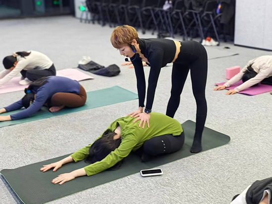 考慮到學員多為瑜伽新手,張春燕老師摒棄復雜體式,以“基礎入門、舒緩放松”為核心,從最簡單的站姿、坐姿教起,細致講解每個體式的動作要點、發力部位以及對身體的益處,耐心解答學員的疑問,用鼓勵的話語引導大家突破自我,緩解初次練習的緊張感。學員在瑜伽墊上凝神專注,跟隨老師的指令舒展、拉伸、扭轉,在輕柔的音樂中感受身體的變化,舞蹈室內滿是寧靜祥和的氛圍。伴隨著舒緩的輕音樂,學員們凝神靜氣,跟隨老師的引導舒展肢體,每一次伸展都凝聚著專注,每一次呼吸都承載著放松。大家認真練習、相互交流,在寧靜的氛圍中釋放疲憊,在默契的互動中增進情誼,現場充滿了溫暖與活力。
