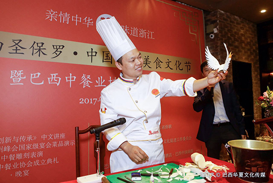 在塞爾維亞期間,他研發(fā)“一帶一路”主題宴席,融合沿線國家食材與浙菜技藝,以“西湖宴”“錢塘宴”等創(chuàng)意菜式讓外國友人感受中華飲食魅力(如魚可做成松鼠形,雞脯肉可制成花形),相關(guān)活動(dòng)在塞爾維亞、意大利引起廣泛關(guān)注,被當(dāng)?shù)孛襟w譽(yù)為“美食外交典范”。2019年,在莫斯科中俄旅游年期間,他將西湖醋魚改良為“伏爾加河鱸魚”,用紅菜頭汁調(diào)制“中國紅”醬料,實(shí)現(xiàn)“舌尖上的對(duì)話”,贏得俄羅斯廚師協(xié)會(huì)主席的高度稱贊。