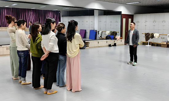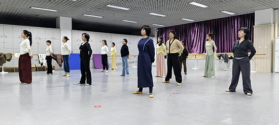 簡短而熱烈的典禮結束后,池溫格老師立即帶領學員展開首次培訓。從基礎熱身到身韻元素練習,再到成品劇目《長安啊》的片段教學,學員們全情投入,沉浸在古典舞的優(yōu)雅意境中?!堕L安啊》以袖為主,盤腕穿手以指尖引領,雙臂由身前向外盤繞、穿揚;撩袖拋袖則以手背帶力,輕撩慢落,配合大臂開合與拋袖瞬間的舒展,舞蹈核心遵循提、沉、沖、靠,上身中正挺拔,腰胯輕旋。