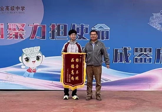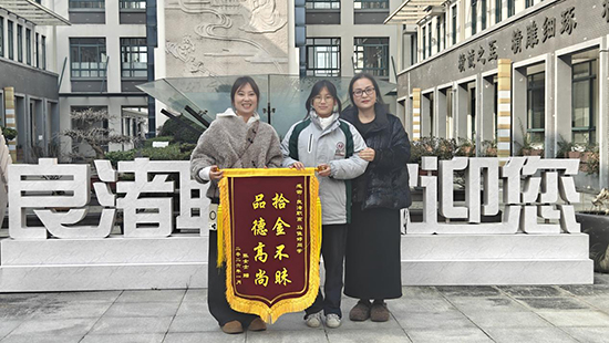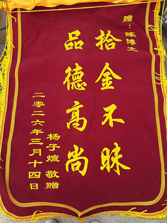 3月21日中午,一面印有“拾金不昧 品德高尚”的錦旗送到了杭州市良渚職業高級中學值班室。失主楊先生緊握著工作人員的手,反復請求轉達他對該校25分析班陳博文同學的誠摯謝意。