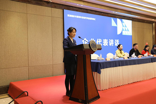 儀式伊始,湖州賓館企業(yè)代表沈美華發(fā)表講話。她結(jié)合行業(yè)發(fā)展趨勢(shì)與企業(yè)用人需求,勉勵(lì)學(xué)生珍惜學(xué)習(xí)機(jī)會(huì),虛心向?qū)熣?qǐng)教,努力在實(shí)踐中錘煉專業(yè)技能、提升職業(yè)素養(yǎng)。