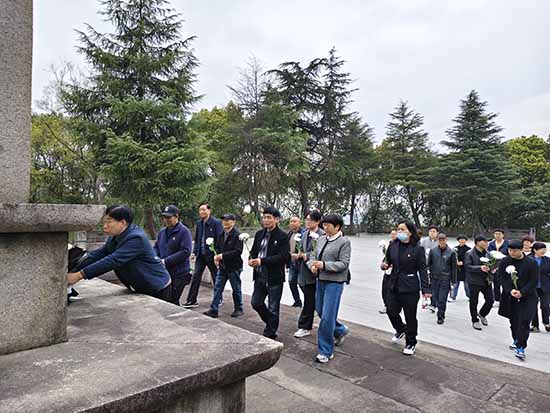 會后,社區組織黨員前往柯橋區烈士陵園,開展清明祭掃活動。全體黨員在烈士紀念碑前整齊肅立,向革命先烈敬獻花籃,深切緬懷革命先烈的豐功偉績。在社區黨委書記領誓下,全體黨員面向黨旗莊嚴宣誓,重溫入黨誓詞,鏗鏘誓言回蕩陵園,彰顯黨員堅守初心、勇擔使命的堅定信念。儀式后,黨員們駐足瞻仰烈士墓碑,追憶革命先輩的奮斗歷程,接受深刻的紅色教育與精神洗禮。