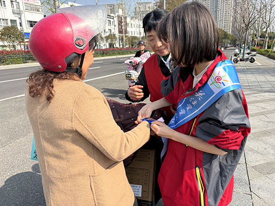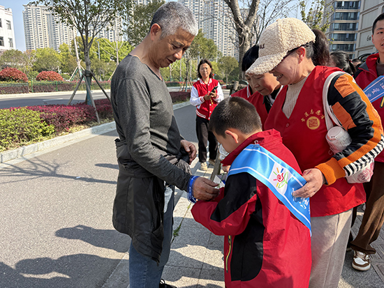 活動現場,志愿者陪伴孤獨癥小朋友在小區大廳設立了暖心宣傳點。在志愿者的耐心引導下,孩子們化身小小關愛宣傳員,主動為來往居民送上印有孤獨癥關愛標語的定制紙巾,將科普知識融入日常小物件,貼心又接地氣。緊接著,小朋友們還與志愿者一起,為居民系上象征關愛與包容的藍絲帶,輕盈的絲帶系在腕間隨風飄動,既表達了對孤獨癥群體的支持,也把包容與善意傳遞給了每一位鄰里。