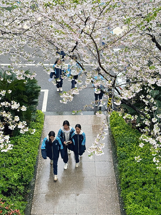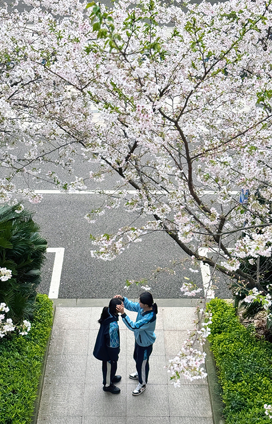 課間,師生紛紛駐足拍照,用鏡頭定格春日的美好。一條鋪著灰色石板的小徑貫穿花海,兩側(cè)綠灌木整齊列隊(duì),幾位女生結(jié)伴而行,長(zhǎng)發(fā)女孩低頭專注書本,側(cè)身女孩笑意盈盈與同伴低語(yǔ),另一人輕松翻閱筆記,步伐輕快,仿佛將課堂的書香也帶入了這自然的課堂。小徑盡頭,更多學(xué)生或三五成群合影留念,或獨(dú)自坐在櫻花樹下靜心閱讀,任花瓣輕輕落在書頁(yè)上。遠(yuǎn)處車輛緩行,與這靜謐校園構(gòu)成一幅動(dòng)靜相宜的春日畫卷。