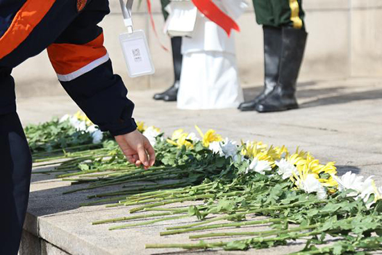 隨后,全體人員肅立默哀,向為民族獨立、人民解放和國家富強英勇獻身的革命烈士致以深切悼念。默哀結束后,儀仗隊向革命烈士紀念碑敬獻花籃,緞帶上 “革命烈士永垂不朽” 的字樣寄托著全體師生對革命先輩的無限追思。同學們依次繞行紀念碑,將鮮花輕放于碑座四周,以樸素方式表達敬意。
