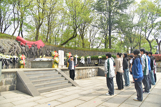 在烈士紀念碑前,全體師生整齊列隊,莊嚴肅立。