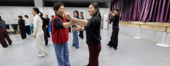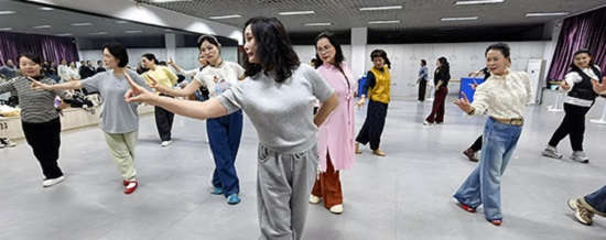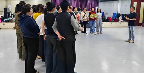 簡短而莊重的開班儀式結束后,兩位老師立即投入到緊張有序的教學中。她們首先帶領學員進行熱身走步,耐心細致地示范步法與手勢,不放過任何一個細節。隨后,根據學員特點與自身優勢,將大家巧妙分為花旦組與小生組,開展針對性教學。在兩位老師的悉心指導下,學員們迅速進入狀態,全神貫注地認真練習,現場學習氛圍濃厚。不久,大家便轉入越劇經典劇目《牡丹亭·驚夢》的學習中,各展風采,將越劇的韻味展現得淋漓盡致,現場仿佛一場精彩的越劇盛宴正在徐徐拉開帷幕。