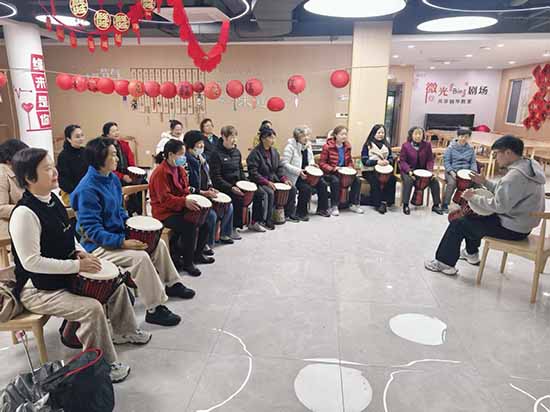 非洲鼓課:激情鼓點,釋放快樂。作為最“潮”的課程,非洲鼓深受歡迎。學員們圍坐一圈,手掌擊打出明快的節奏,在鼓聲中忘卻年齡,盡享歡樂。