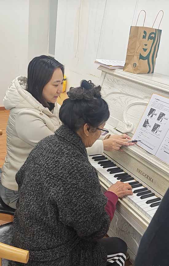 鋼琴課:黑白琴鍵流淌溫情。零基礎也能彈奏優美旋律,學員們從指法練習到簡單曲目,指尖跳躍間,奏響晚年新樂章。