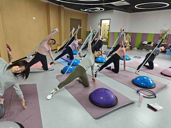 瑜伽課:一呼一吸,舒展身心。在輕柔的音樂中,學員們跟隨老師練習體式,提升柔韌性,放松心情,煥發內在活力。