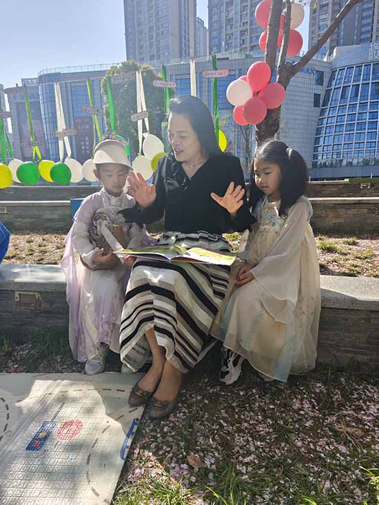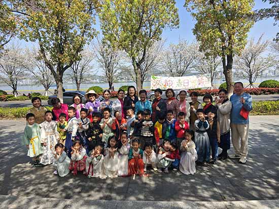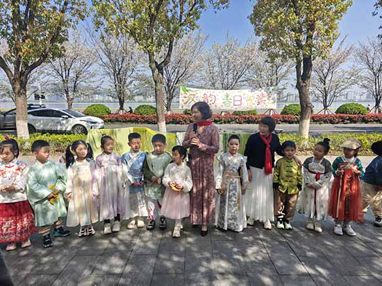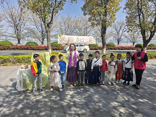 古樂悠揚,櫻花翩躚。朗誦班的學員們與身著漢服的孩子們有序入場,大手拉起小手,踏著落英繽紛的櫻花跑道款款而來。孩子們衣袂飄飄,老人們笑容盈盈,大家結對而坐。一聲問候、一個微笑,跨越年齡的距離就此消融。櫻花樹下,銀發與童顏相映成趣,成為江畔春日里最溫暖的一道風景。