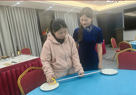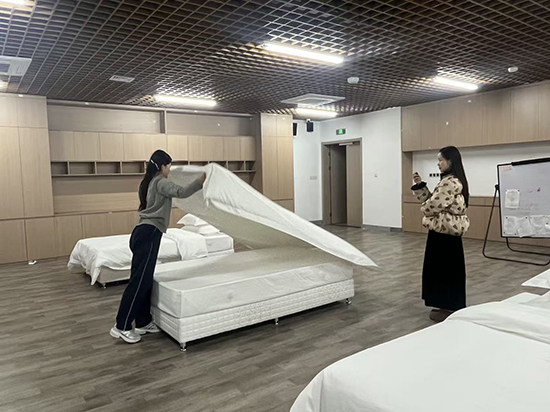 備賽期間,該校三位同學(xué)在指導(dǎo)老師的帶領(lǐng)下,開啟了高強(qiáng)度、精細(xì)化的訓(xùn)練模式。從客房鋪床的拋單、包角、套被、放枕,到中餐擺臺的定位、折花、斟酒、托盤,每一個(gè)動作、每一處細(xì)節(jié)都反復(fù)打磨、精益求精。為精準(zhǔn)貼合大賽標(biāo)準(zhǔn),老師們對照賽項(xiàng)規(guī)程,逐一對時(shí)間控制、操作規(guī)范、儀容儀表、服務(wù)禮儀進(jìn)行嚴(yán)格指導(dǎo);同學(xué)們放棄休息時(shí)間,反復(fù)練習(xí)、糾錯提升,在無數(shù)次實(shí)操中練就流暢嫻熟的技能,在團(tuán)隊(duì)磨合中形成高效默契的配合。