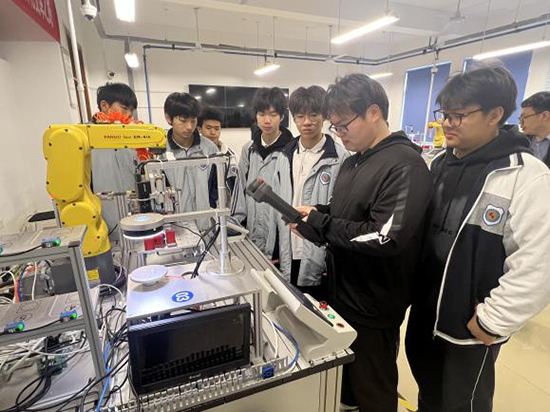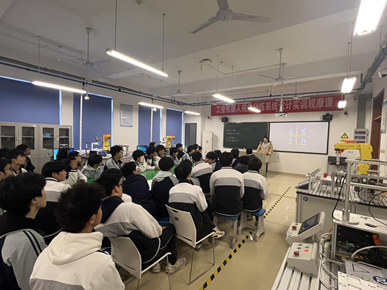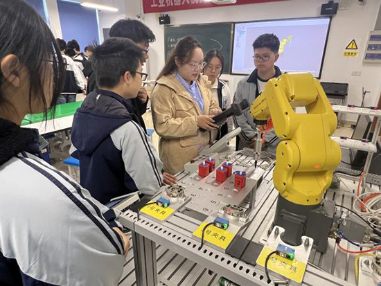 隨后,師生們來到專業實訓室進行參觀學習。浙江工貿職業技術學院工業機器人技術專業作為溫州市高職院校示范實訓基地,擁有先進的工業機器人機械臂、智能工作站等實訓設備。參觀過程中,該院學生為柳市職校的同學們帶來了一堂生動的工業機器人機械臂運動實操課。從機械臂的基礎結構講解,到精準的點位控制、軌跡運動演示,再到手把手指導編程與操作,每一個環節都讓同學們目不暇接、興致盎然。大家近距離感受智能制造技術的魅力,親手體驗機械臂的操控,直觀了解專業核心技能與未來學習方向,進一步激發了對專業學習的熱情與向往。